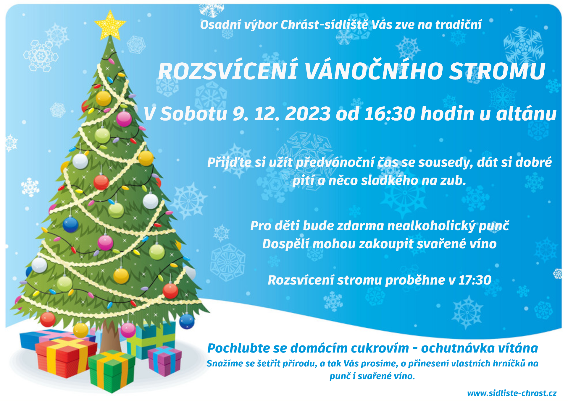 Vezměte dětičky, babičky a dědečky, zkrátka celou rodinu a přijďte si užít předvánoční atmosféru, poslechnout a zazpívat koledy, dát si výborný svařák, nebo nealko punč, a hlavně společně rozsvítit vánoční strom.